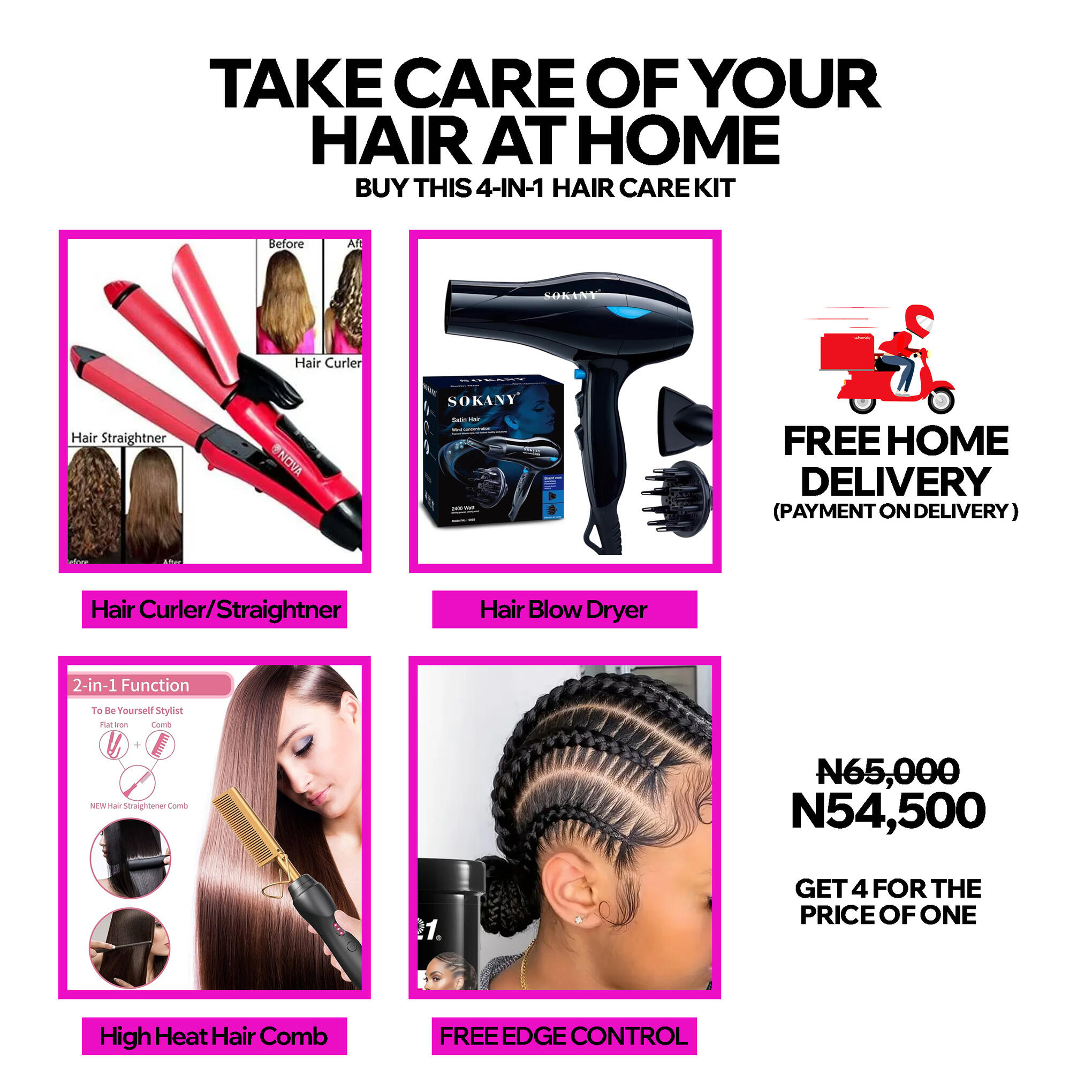 THIS 3-IN-1 HAIR KIT INCLUDES HAIR CURLER, BLOW DRYER, HIGH HEAT COMB AND A FREE EDGE CONTROL PLUS FREE DELIVERY